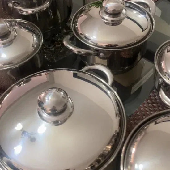 El kit completo incluye 6 ollas de diferentes tamaños (generalmente de 1 L a 5 L, con tapas) y una tetera elegante, perfecta para familias o uso profesional. Su diseño clásico y apilable facilita el almacenamiento, con un peso total aproximado de 8-10 kg.
